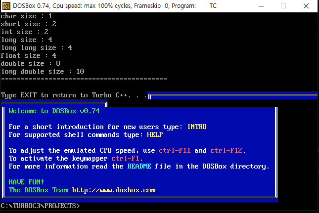 과거의 컴파일러(?) Turbo-C를 구해서 돌려보았다.