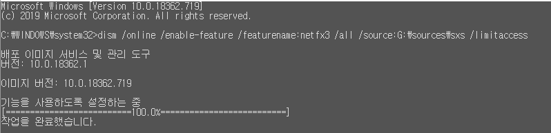 " dism /online /enable-feature /featurename:netfx3 /all /source:cab파일의위치(경로) /limitaccess "